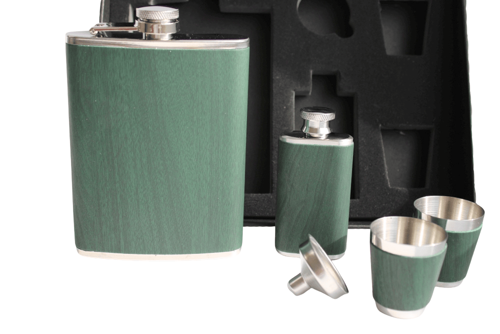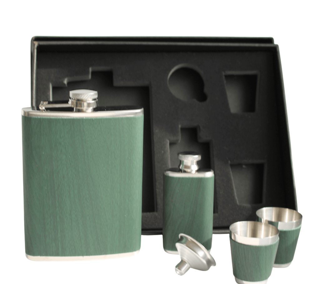 Mit diesem hochwertigen Set aus gebürstetem Edelstahl wird jeder Schluck zum kleinen Luxusmoment. Die 8-Unzen-Flasche* im edlen Dunkelgrün mit feiner Holzmaserung liegt griffig in der Hand, ist absolut auslaufsicher und bewahrt den vollen Geschmack von Whisky, Rum oder Likör. Zwei handliche 2-Unzen-Gläser laden zum spontanen Anstoßen ein, während der passgenaue Edelstahl-Trichter das Befüllen sauber und mühelos macht. Alles verpackt in einer formschönen Geschenkbox – perfekt für Ausflüge, Picknicks oder als geschmackvolles Präsent für Freunde und Genießer jeden Alters.