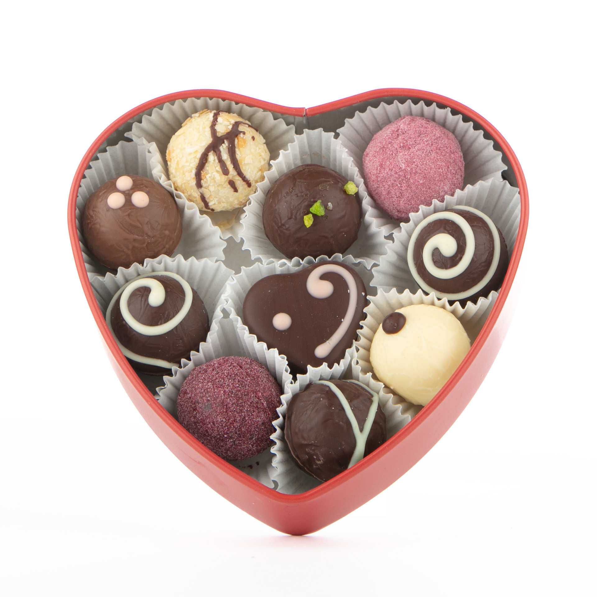 Herzdose aus Metall gefüllt mit 10 verschiedenen Pralinen .Die Pralinen sind gefüllt mit einer cremigen Ganache, die sich in perfekter Geschmacksharmonie mit der sie umhüllenden hochwertigen Schokolade verbindet.In die cremige Ganache ist der Alkohol eingearbeitet für den perfekten Genuß.Die Pralinensorten können je nach Saison variieren.