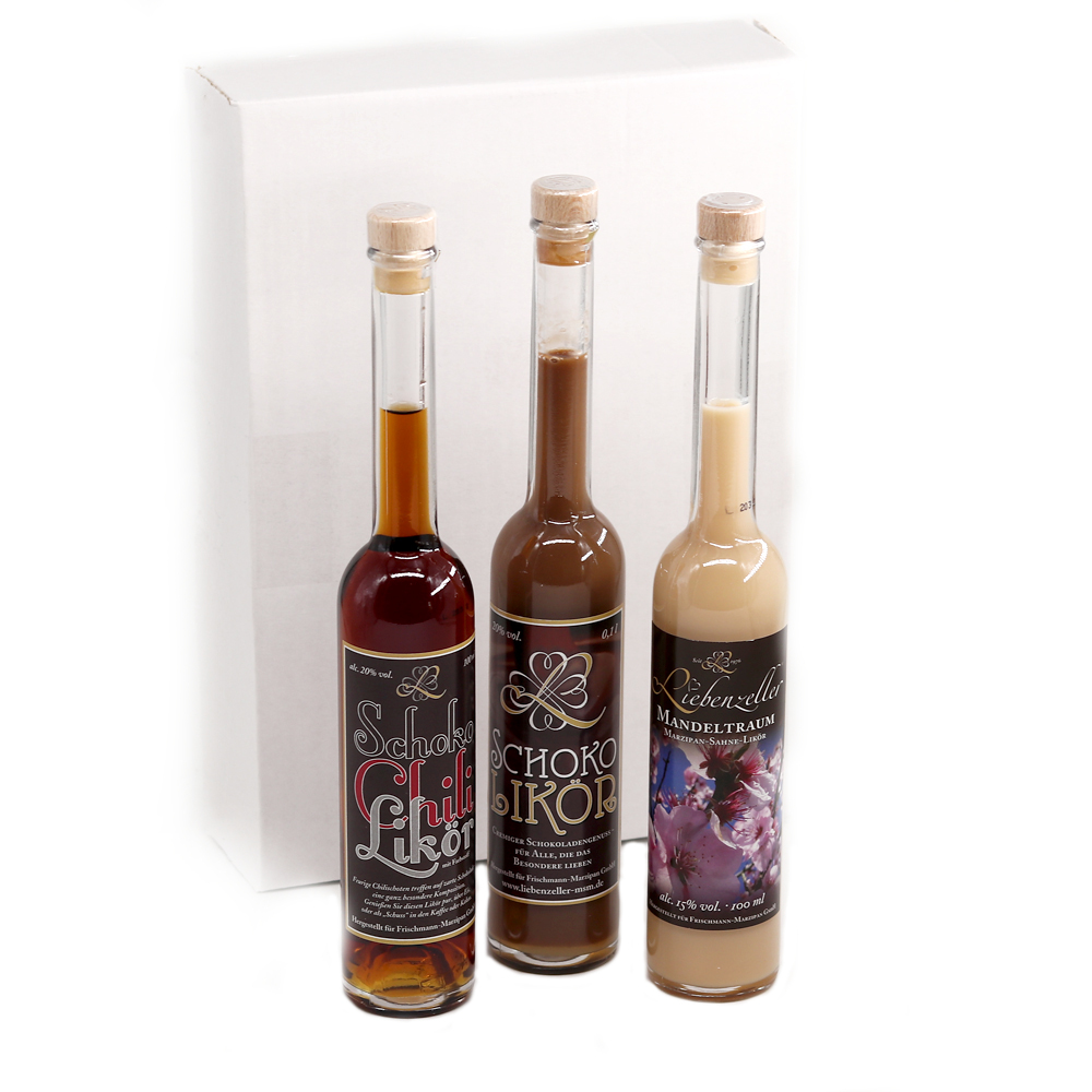 Dieses Probierpaket enthält 1 x cremiger Marzipan-Sahne-Likör 100ml, 1 x vollmundiger Schoko-Creme-Likör 100ml und 1 x feuriger Schoko-Chili-Likör 100ml.