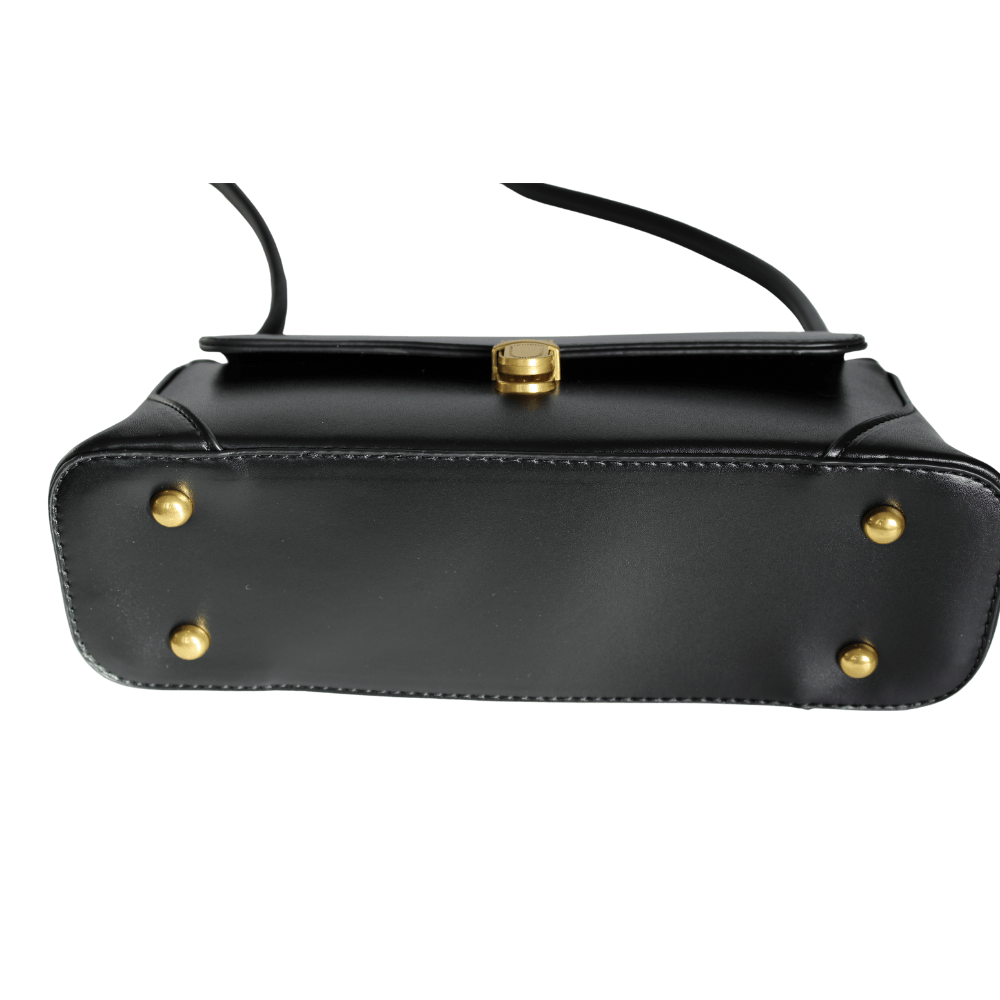 Diese edle Umhängetasche besticht durch ihr minimalistisches, modernes Design und die feine Verarbeitung aus hochwertigem, glattem Leder in einem edlen Schwarz. Die goldfarbene Schließe an der Vorderseite verleiht dem Modell einen Hauch von Luxus und sorgt gleichzeitig für sicheren Verschluss. Im Inneren bietet die Tasche ausreichend Platz für Ihre